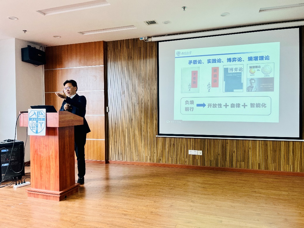 党课伊始,张学龙结合近三十年纪委工作经历的反思,通过“四论”引出了“清廉人生路,迈好第一步”的党课主题。其中,“四论”是指矛盾论、实践论、博弈论和熵增理论。他谈到:要将矛盾论和实践论结合起来运用,抓住事物的主要矛盾及其运动规律,善于运用实践论去认识事物并解决问题;博弈论应用于社会生活的各个方面,要学会将竞争对手转化为合作伙伴,甚至是志同道合的朋友,在博弈中相互促进,不断提高;熵增理论告诉我们,一个优秀成功的人应当与熵增作斗争,利用开放、自律、智能化三原则,敢于迎接挑战,坚守自己的原则,提高对自我的要求,通过学习和努力不断实现突破,做到负熵前行,涅槃重生。张学龙希望同学们认真研读“四论”,清楚认识到选择和努力的关系,把握好自己人生的方向,不断提高个人格局、深度及底蕴。