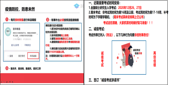 疫情防控,防患未然张异强调:“疫情尚未结束,防控切莫大意”。她呼吁同学们为响应学校疫情防控要求,每位同学每天应该按时按量进行体温填报。并且告知同学们在疫情防控期间尽量少离校和好个人防护以及因特殊情况不得不离校的请销假说明。诚信考试,从我做起临近期末,同学们一定要找准复习的方式方法,提前做好复习准备,并组织同学们签订诚信考试承诺书。