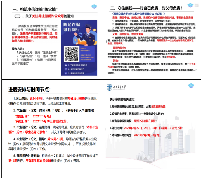 提高防范意识,平安快乐生活张异带领同学们学习电信诈骗常见案例,分析罪犯常用的诈骗手法。为提高同学们的安全意识,并组织本科2017级全体同学关注并注册反诈公众号。大会临近尾声,随后就近期毕业设计寒假放假的注意事项做相关通知,提醒同学们注意课设选题和回家购票时间。
