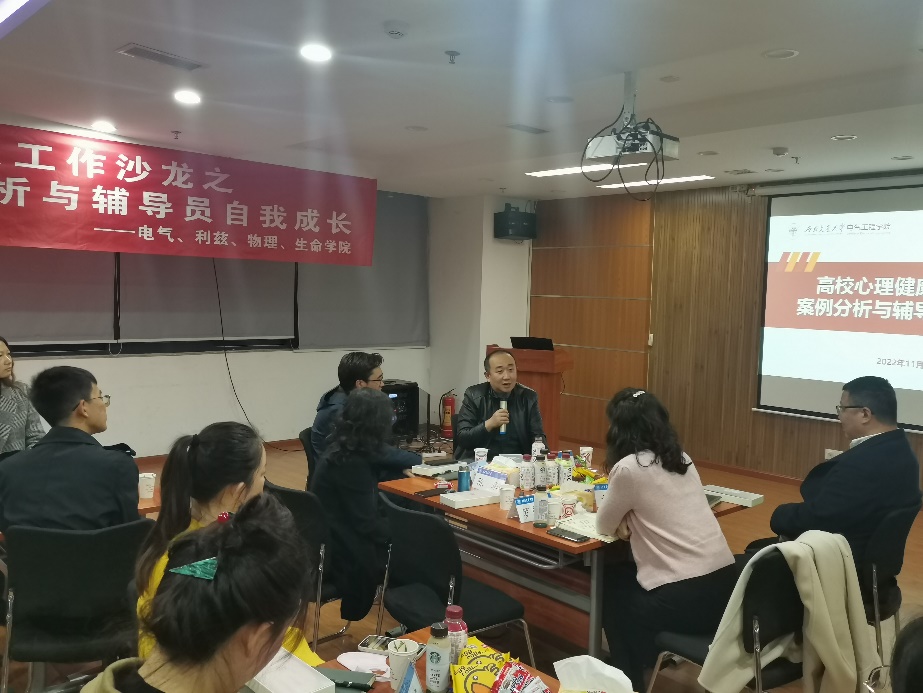 为切实加强辅导员队伍建设,及时分析、研判、解决大学生日常思想政治教育工作中面临的新形势、新问题,11月28日下午16时,由党委学生工作部主办,正妹av 、生命科学与工程学院、物理科学与技术学院、利兹学院承办的第四期“知行”辅导员工作沙龙在电气馆10832举行,研讨高校心理健康教育工作案例分析与辅导员自我成长方面的问题。心理咨询中心主任陈华,电气学院党委书记罗乾超,学工部副部长邢晓鹏,生命学院党委副书记朱炜,物理学院党委副书记郭剑,电气学院党委副书记谢力,利兹、生命、物理、电气学院辅导员参与此次工作沙龙。活动由正妹av 党委副书记谢力主持。