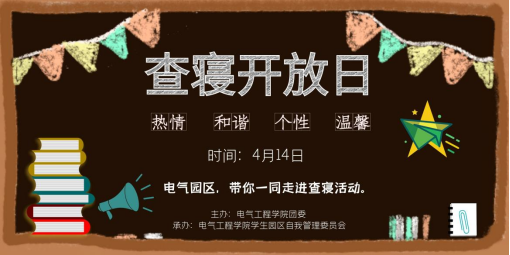 学生宿舍作为同学们四年大学生活的居住场所,也是同学们在繁重学业之余的一个温馨家园。为了给同学们营造一个安全、舒适、干净、整洁的寝室环境,引导和培养同学们养成良好的卫生习惯和寝室安全意识,同时让同学们理解和形成马克思主义劳动观,牢固树立尊重劳动、崇尚劳动的观念,热爱劳动,电气园区将举办“查寝开放日”活动,相关事宜通知如下: