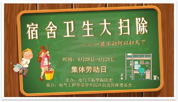 为全面落实中共中央国务院《关于全面加强新时代大中小学劳动教育的意见》,深入学习贯彻习近平总书记在全国教育大会上的讲话精神,同时迎接即将到来的“五一”国际劳动节,电气学院决定以“宿舍卫生大扫除”“我眼中的劳动美”两项活动内容为依托,开展“集体劳动日”活动,引导学生积极参与到活动中来,以自己的切身感受体验劳动带来的乐趣,以劳动促进学生道德品质的提高,充分展示当代青少年学生朝气蓬勃、奋发进取的精神风貌。