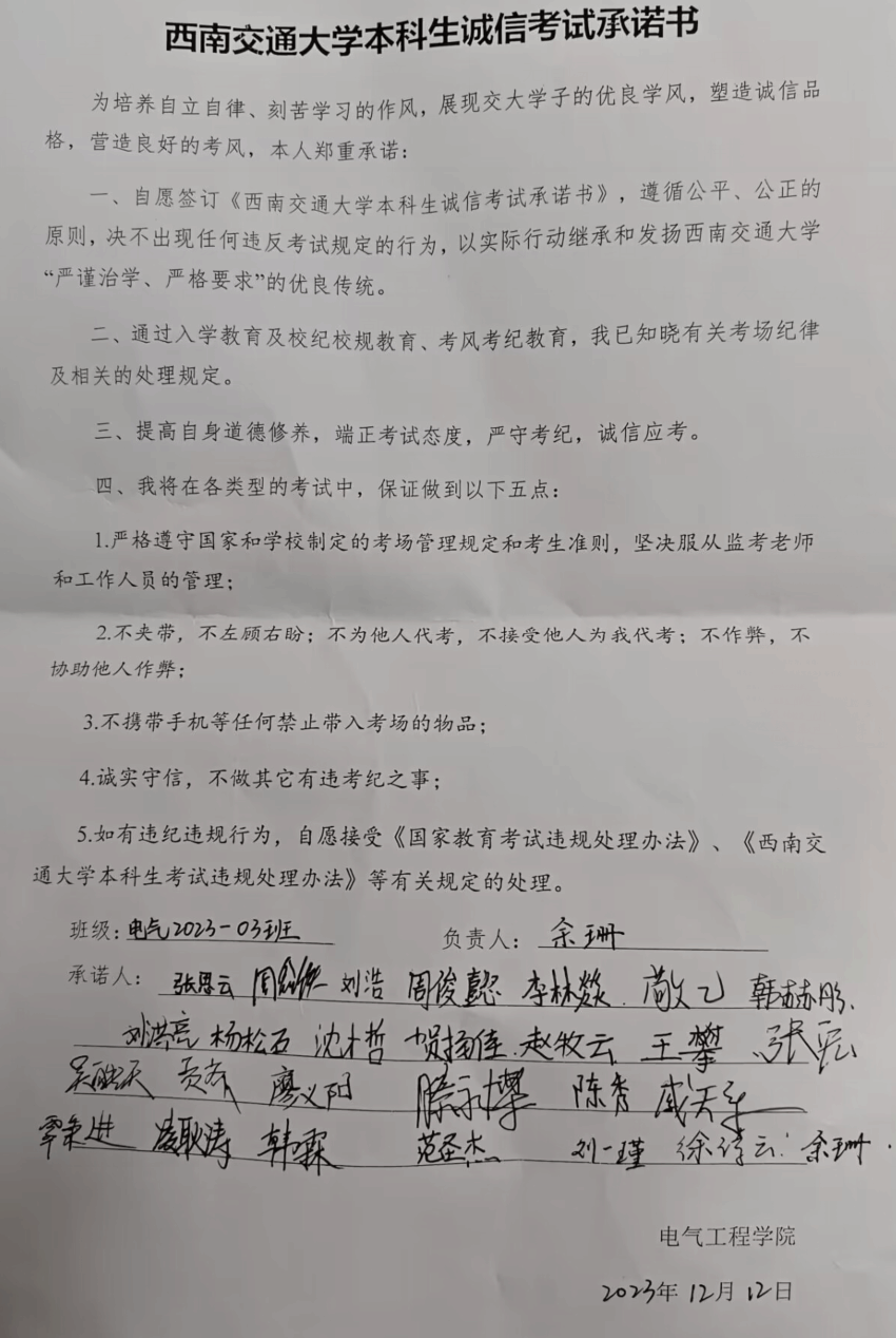 最后,在班长以及学习委员的带领下,同学们依次在考试诚信承诺书上签名,承诺自己诚信考试,绝不作弊。