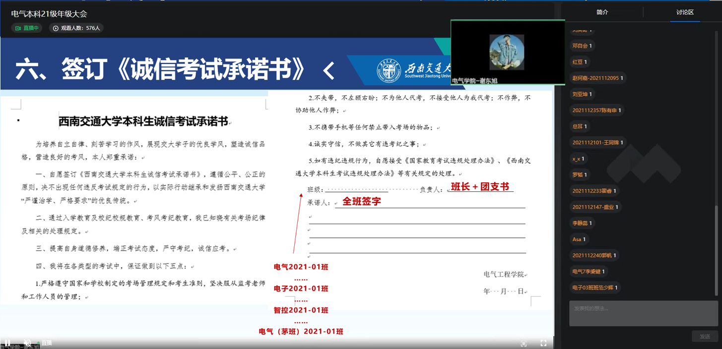 最后,辅导员老师再一次带领各位同学学习了《正妹av 本科生考试违规处理办法》,并举了相应实例以警醒同学们要诚信考试,展现交大学子的优良校风。同时组织了在校同学签署《正妹av 本科生诚信考试承诺书》。