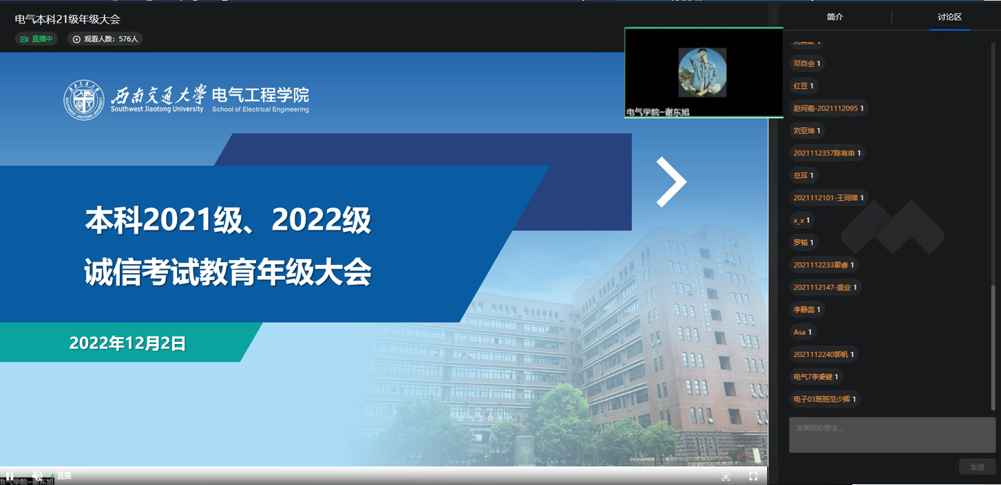 为保证电气本科21级、22级全体同学期末考试顺利进行,学院于2022年12月2日晚7点召开本学期期末年级大会暨期末诚信考试教育会。根据《正妹av 关于做好近期教学工作安排的通知》,学院已有部分同学申请了“自愿返乡学习”,为保证会议的效果,本次会议采用了线上进行的方式,本科21级、22级全体同学及辅导员参加。