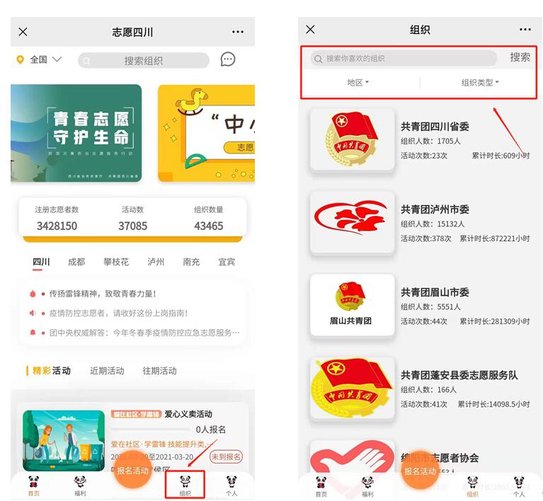 进入“志愿四川”平台正妹av,点击下方组织,按照标准筛选或自己输入,找到组织。