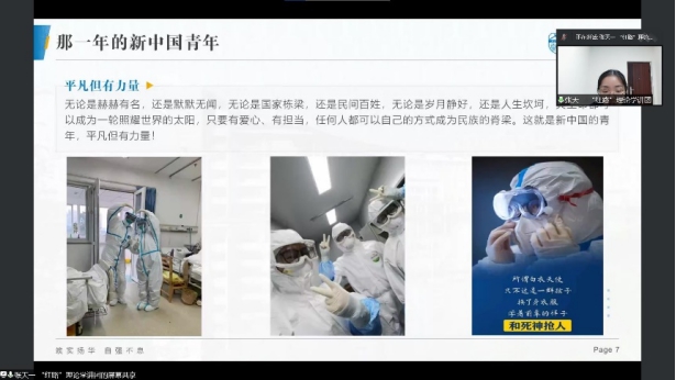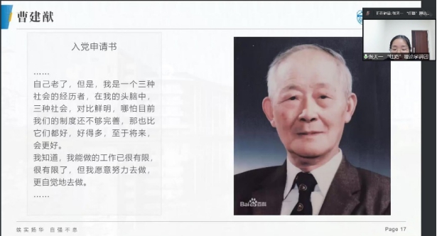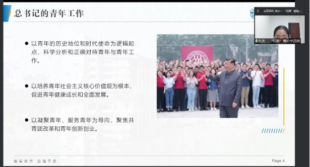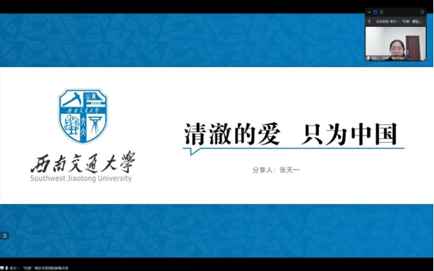 张天一以《新时代中国青年的责任与担当》为主题,从习近平总书记的青年工作切入,以“清澈的爱 只为中国”这句来自戍边战士陈祥榕对祖国的深情告白为概括,向大家展示了在平凡工作上甘于奉献、在基层岗位上勇于担当、在紧急任务前冲锋在先、在创新创业中走在前列等新一代中国青年形象。最后张天一以曹建猷院士的入党故事为例,号召大家心怀祖国、志存高远,秉承奋斗不息的精神,更有底气,更有魄力地回答时代之问。