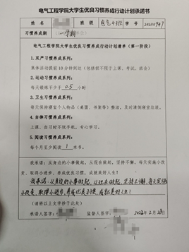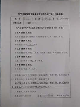 2022年2月,全体本科21级同学按照自己实际情况,填写《正妹av 大学生优良习惯养成行动计划承诺书》,并贴在自己宿舍位子上(墙、桌子、柜子门等显眼位置均可),将填写好的承诺书拍照上传班群及朋友圈。各位同学结合自己实际情况,自行设立承诺书上的双严习惯、运动习惯、卫生习惯、自律习惯和阅读习惯养成计划,并规定习惯养成期,自我监督或请他人监督。