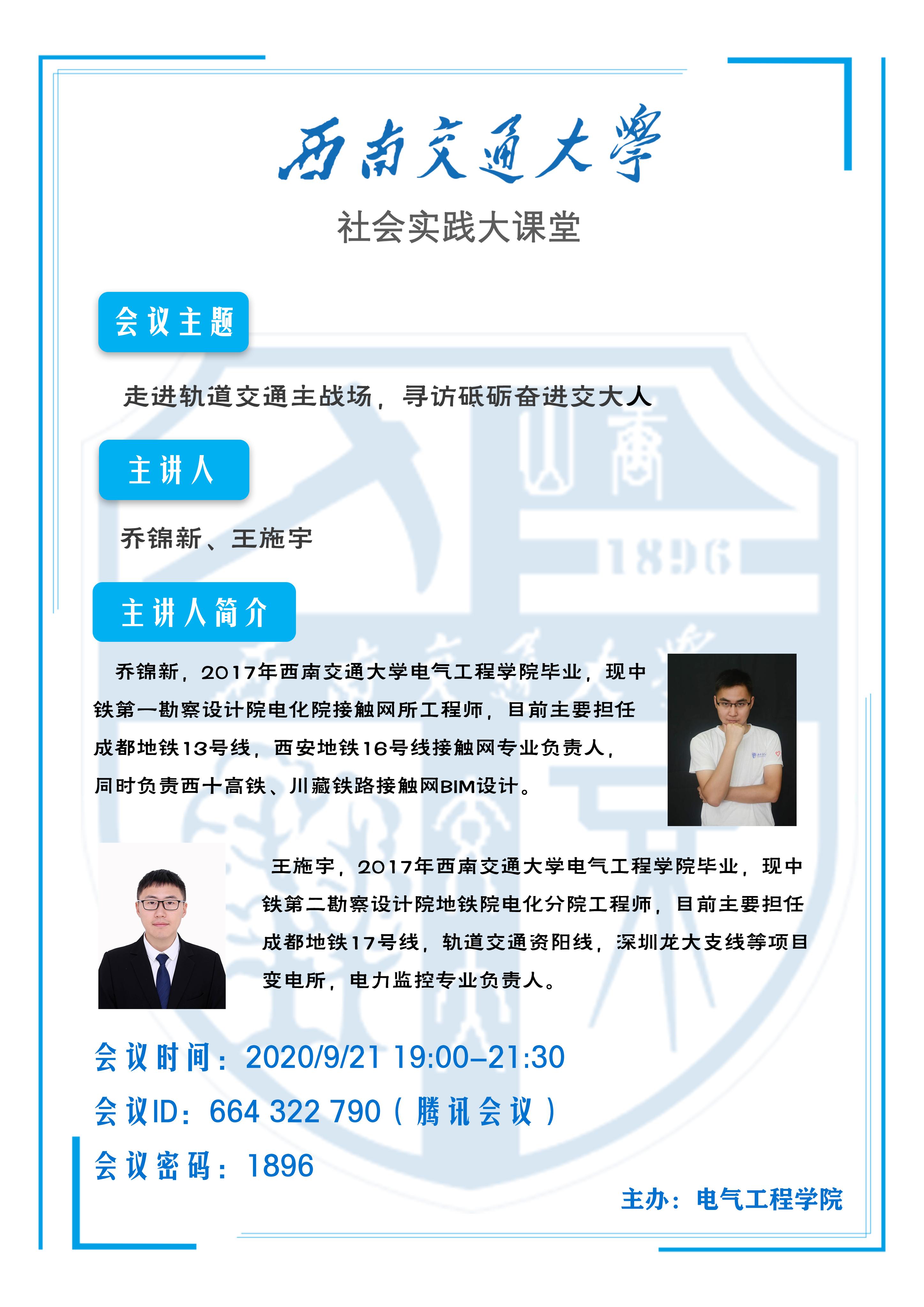 为深入学习贯彻习近平新时代中国特色社会主义思想和党的十九大精神,进一步学习体会新时代交大人在轨道交通领域中发挥的强大力量,2020年9月21日,正妹av 暑期“三下乡”实践队以开展社会实践大讲台为契机,邀请到了毕业于正妹av 研究生院的优秀校友乔锦新和王施宇学长开展线上经验分享活动。