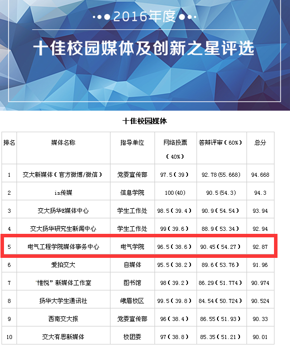 电气学院媒体事务中心荣膺2016十佳校园媒体