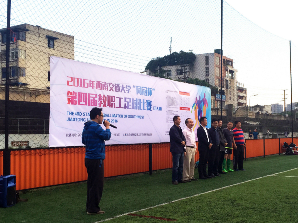 2016年4月20日下午6时30分,西南交大 “同冠杯”第四届教职工足球比赛隆重开幕。本次比赛为五人制足球赛,抽签产生A、B、C、D四个小组,赛程共分为两个阶段:小组赛阶段和八强淘汰赛阶段,小组循环赛前两名出线参加八强淘汰赛。我院和后勤保障队、材料学院、力学学院、机械学院位于D组。