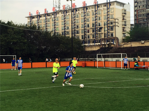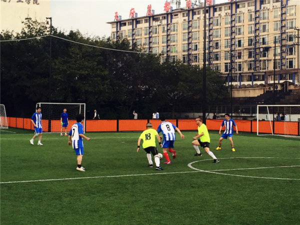 在主席致辞、裁判员宣誓、运动员代表宣誓等一系列开幕流程后,由西南交大足球协会会长宣布比赛正式开始。下午6时45分,我院教职工足球队与机械学院教职工足球队在2号场地开始比赛。双方球员都很快投入到比赛中,跑位积极,盯防严密,双方你进我退、你攻我守,实力相当。上半场比赛由于我方盯防疏漏被对方前锋攻入一球,下半场我方调整了战略战术,采取全场逼抢战术,开场八分钟我方取得一次角球机会,球传出后,我方前锋头球攻门,皮球径直飞入球门远角,我方扳回一球,士气大涨,但高强度的对抗使得我方队员体力消耗很大,接下来的比赛中,我方队员们仍奋勇争夺,坚持到比赛最后一分钟,最终我院1:3惜败。