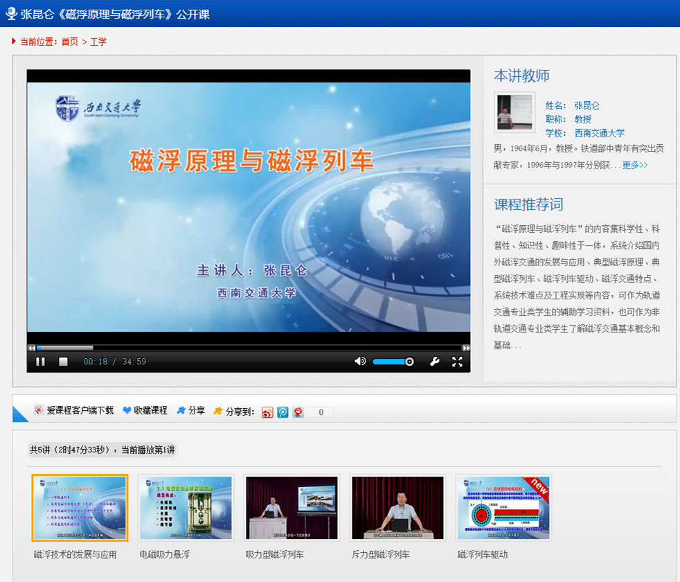 日前,正妹av 张昆仑教授和郭小舟教授主讲的“磁浮原理与磁浮列车”视频公开课,历经近两年的精心筹备和录制,顺利通过教育部与高教出版社的严格审核,于2015年9月在中国大学精品公开课程官方网站“爱课程”网正式上线,成为我院首门正式上线的国家级精品视频公开课程,也是“爱课程”网首门介绍磁浮技术和磁浮列车的国家级精品视频公开课程。