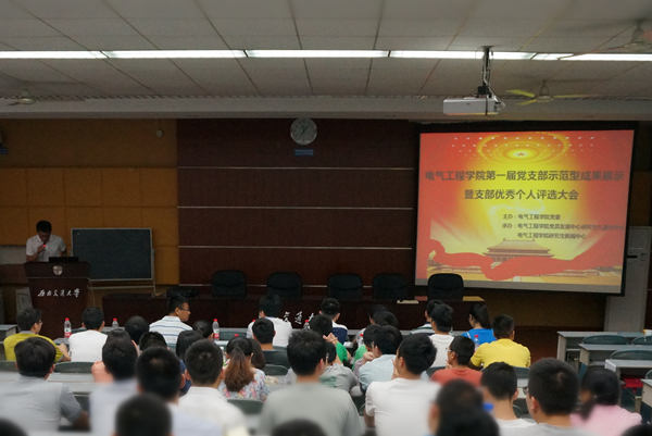 在主持人幽默诙谐的开场白后,本次活动正式举行。活动包括两个部分,第一部分,首先各个党支部的党支书通过ppt风采展示,向观众和评委展现各自的党支部的示范性成果,嘉宾会进行相关提问,最终通过评委打分决出各个奖项。各个党支部通过抽签决定各自出场的顺序,首先出场的是电气第一党支部,秦晓宇同学和他们的党支部制作了精美的ppt与微视频,向大家清楚地展示了自入学以来该党支部举办的活动,及党支部内部情况。随后是第二党支部还对自己的党支部提出了规划。各个党支部依次进行示范性成果展示,向大家展示了各自支部近一年来的成果。之后各个评委开始对每个党支部的成果展示进行打分。