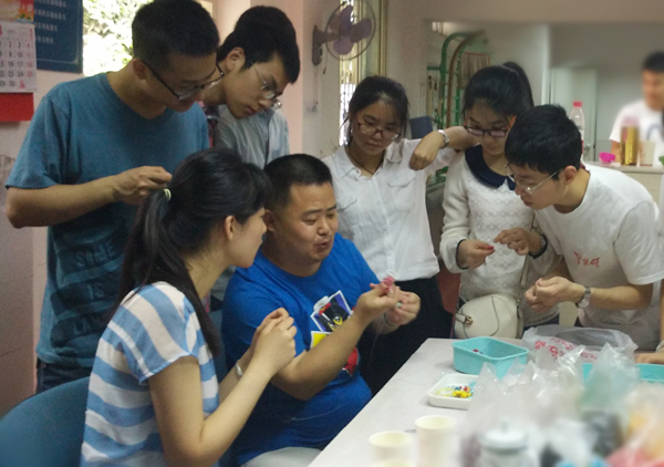 在听完茜姐的介绍后,看着残疾人朋友做手工艺品的认真态度,同学们被他们待人的真诚与对生活的热情所打动。海鹰哥在手工艺品的制作上经验丰富,同学们纷纷拜他为师,跟着他做“裙子女孩”。“裙子女孩”是由串绳将珠子串成一个穿着裙子的女孩子的手工艺品,主要难点是串绳的打结、回串,珠子的排列等。在海鹰哥一步一步的指导下,同学们也认真的学了起来。另一部分同学在得知卡拉OK的话筒出问题了,积极地帮助解决问题。在反复测验后,发现是接口处出现了松动,最终解决。大家还一起唱了几首歌。他们洪亮深情的声音深深感染着在场的每一个人。
