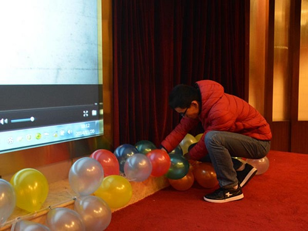 记者了解到,现场工作人员早早的就过来进行场地布置。场地面积不算大,大厅中间整齐的摆放着嘉宾和观众座位,舞台前和走廊扶手两边布置着气球彩带,现场还有一部分工作人员正在继续气球布置的工作,场地上散落着许多气球,一些正在等候进行节目彩排的同学,也热心的参与进来,和工作人员一同布置场地。