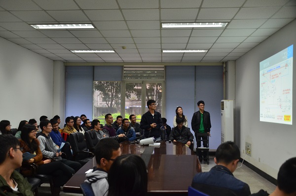 上午10时许,同学们到达川大望江校区。在简单参观完实验室后,同学们来到会议室,此次学术交流活动正式开始。首先,两校同学对各自的学校、学院以及实验中心情况作了简单介绍。随后,双方学生代表开始依次介绍各自的主要研究方向。我校李朝阳同学引经据典,以幽默风趣地为在场同学介绍自己的研究方向和实验室团队,拉近了两校同学的距离,黄锐森同学更是从自己的法国留学经历讲起,并提到了中西方在工程方面人才培养模式的差异以及丰富多彩的留学生活,在场同学们听的十分入神。川大李锴科同学也详细介绍了自己所在实验室的研究领域,同时建议双方可以定期开展学习交流会。整个交流过程当中,气氛活跃,最后双方同学合照留影,此次交流会取得了极好的效果。