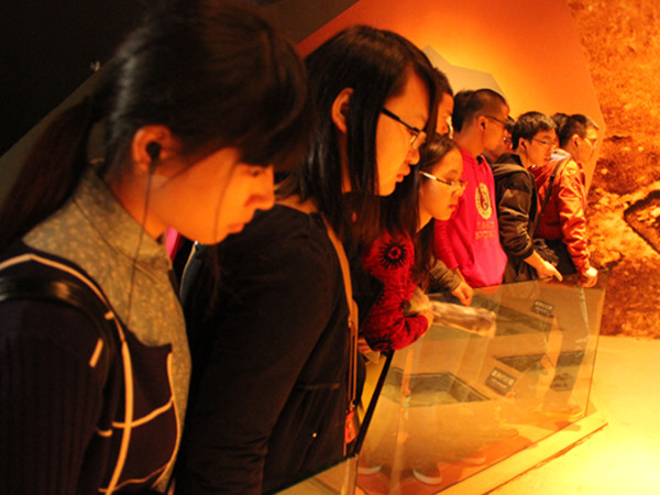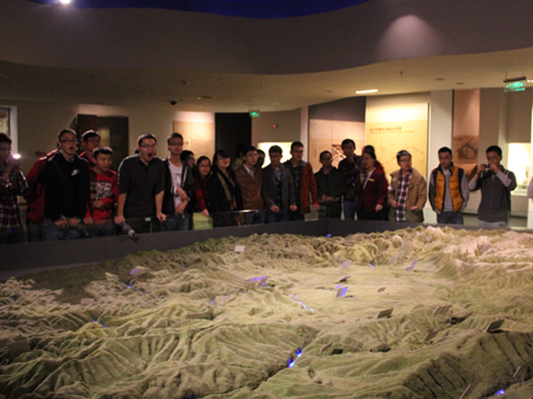 我们的第二站来到陈列馆,该馆由五大展厅组成,分别为:远古家园、王都剪影、天地不绝、千载遗珍、解读金沙。在参观位于陈列馆二层西厅的远古家园时,同学们都被眼前的大型想象复原半景图惊呆了:碧野蓝天,见底河水,淙淙溪流,绿草花丛,莺歌燕舞,万兽嬉戏,林荫掩映着古朴的民居,远处传来狩猎归来的欢声笑语,3000年前成都平原和谐美好的生态环境俨然就在眼前。画布与实景相结合,声、光、电相结合,虚与实和谐自然地交融在一起,拉近了现实与过去的时空距离,也激起了现代人对田园生活的向往。
