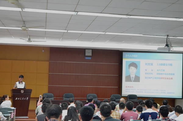 首先进行的是硕士组的申请答辩,35名硕士生根据前期会议的抽签排序结果,依次对自己的学术研究进行了说明展示,从各EI、SCI以及各中文核心期刊的论文发表,到申请的若干发明专利,再到各自参与或主持的国家自然基金项目等,35名硕士研究生用短短的3分钟,向大家展示了各自在这几年研途中的所得、所获。同时,我院的学术精英们也向大家展示了他们学霸的另一面——在生活里,他们并不是一个个枯燥的学习机器,登山、骑行、比赛、健身、球类运动、集体活动,也都丰富着他们的研途生活。在这些申请国奖的硕士里,有免研升学的,也有考研升学的,有一帆风顺的,也有出现过重大实验失误炸了高功率的IGBT的,所有的这一切向我们说明了,学术成功的大门为一切勤奋努力的人敞开。