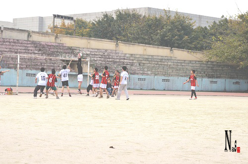 随着主裁判的一声哨响,决赛正式开始,身穿红黑条纹队服的是12级7班,身穿白色队服的是12级8班。开场后,12级7班队员通过积极的跑位,有效的逼抢掌握着场上主动,第5分钟,7班的8号在禁区内接队友传球,扣过一名防守队员抽射,由于打的太正被守门员扑出。随后的几分钟里,7班队员通过任意球,角球,远射不断地在8班的门前制造险情,但8班球员通过积极地防守一次次化险为夷。第27分钟,8班开出角球,8班的1号门前抢点头槌破门,1:0,场上比分被改写,8班率先破门。取得领先后,8班由被动转为主动,通过积极地拼抢不断给7班的后防线施加压力。在随后的十几分钟里,比赛双方都没有取得进球,1:0的比分保持到上半场结束。