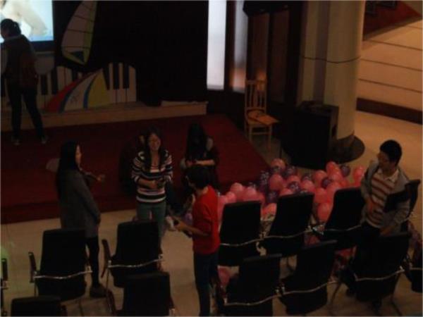 迎新晚会当天,从下午4点起,工作人员就陆续来到晚会现场做准备工作。会场的清理与重新布置,桌椅摆放与道具准备,演员的服饰与化妆,灯光、音响设备的调节等工作逐步有序展开。每个工作人员都紧绷神经,在各自的岗位上恪尽职守。研会会长付欤翔从始至终一直在晚会现场指挥并协调各个小组的工作。来自五班的张娟同学作为晚会的礼仪之一,在忙前忙后的同时,还参与了他们班级的《舞蹈串烧》节目,最后还作为记者采访了高院长……等等。会场布置、彩排、正式演出、晚会后会场清理,直至晚会结束的11点,在各位工作人员近7个小时的努力后,迎新晚会终于圆满落幕。
