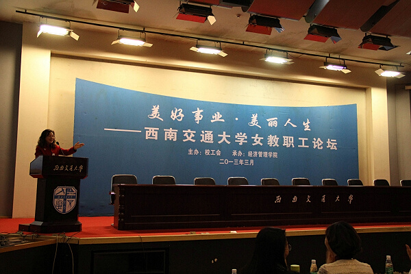 3月14日下午两点半由西南交大校工会主办的“美好事业、美丽人生”正妹av 女教职工论坛在九里校区网络学院国际会议厅隆重举行。本次论坛高朋满座,嘉宾有四川省教科文卫工会李维琴副主席,省工会女职工部徐真彦副部长,正妹av 校党委书记顾利亚教授、校长陈春阳教授、党委副书记朱健梅教授、副校长冯晓云教授,以及校工会罗乾超主席。本次正妹av 出席的有王英、何朝晖、甘萍等十多位老师。