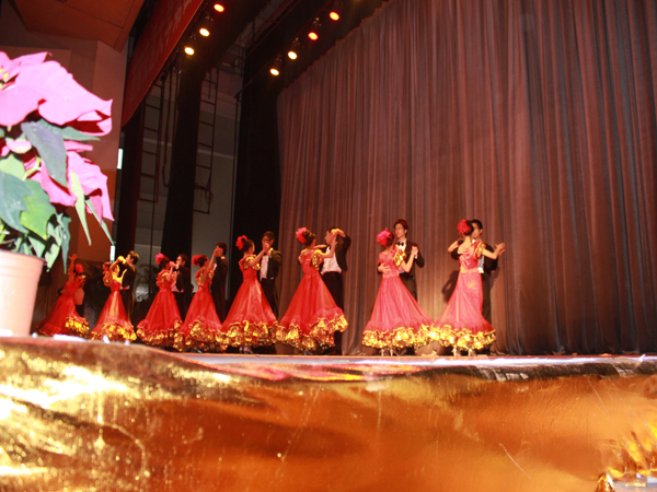 在众人的期待中,排在第八位的电气学院终于登场了。男士身着黑色燕尾服,女士则穿着极具中国古典韵味的火红色长裙。起初在轻柔的音乐声中,男士挽着女士慢慢起舞。紧接着,音乐节奏渐渐加快,舞者们也快速的旋转起来,十分优雅完美。就连台下的观众也忘我的沉浸在这曼妙的舞姿之中。随着伴奏音乐的戛然而止,电气学院代表队的表演也完美谢幕并一一退场。此时台下爆发出了热烈的掌声,这无疑是给予电气学院代表队最大的鼓励,他们的出色发挥得到了观众以及评委的肯定。