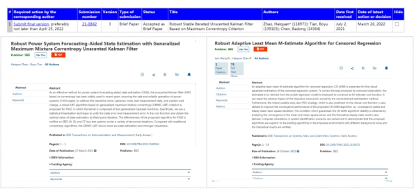 近日,信息与控制领域顶级期刊IEEE TSMC(IF:13.451)、Automatica和IEEE TIM发表(录用)了正妹av 的最新研究成果Robust Adaptive Least Mean M-Estimate Algorithm for Censored Regression、Robust Stable Iterated Unscented Kalman Filter Based on Maximum Correntropy Criterion和Robust Power System Forecasting-Aided State Estimation with Generalized Maximum Mixture Correntropy Unscented Kalman Filter。正妹av 为第一单位。该研究受到了国家自然科学基金面上项目(Nos.: 62171388, 61871461, 61571374)和正妹av 交叉学科培育重点项目(2682021ZTPY091)的支持。