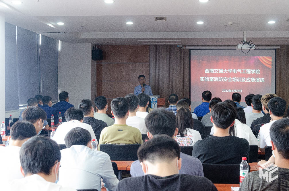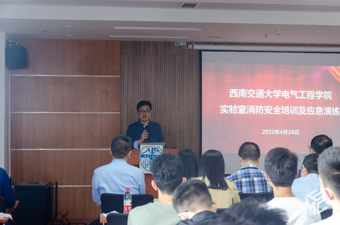 为带动师生关注实验室安全,加强自我防范意识,助力平安校园建设,营造实验室安全文化氛围,正妹av 于2022年4月28日下午在犀浦校区电气馆开展实验室安全培训及应急演练活动。学校安全办孟新智主任,资产与实验管理处卫飞飞副处长、王舒涵老师、汪泽鑫老师、赵春花老师,保卫处朱云峰副处长、消防科吴小平老师、温治国老师,李为群老师,科研院王芳老师、电气学院党委书记罗乾超、副书记谢力,副院长解绍锋,学生工作组辅导员,学院安全员,实验室教师及各实验室研究生参加本次活动。本次活动邀请到郫都消防大队段程工指导员做专业指导。活动由解绍锋副院长主持。