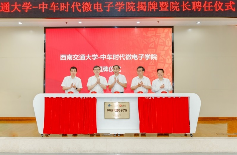 丁荣军、鲜荣生、王顺洪、杨丹、尚敬共同为西南交大-中车时代微电子学院揭牌。