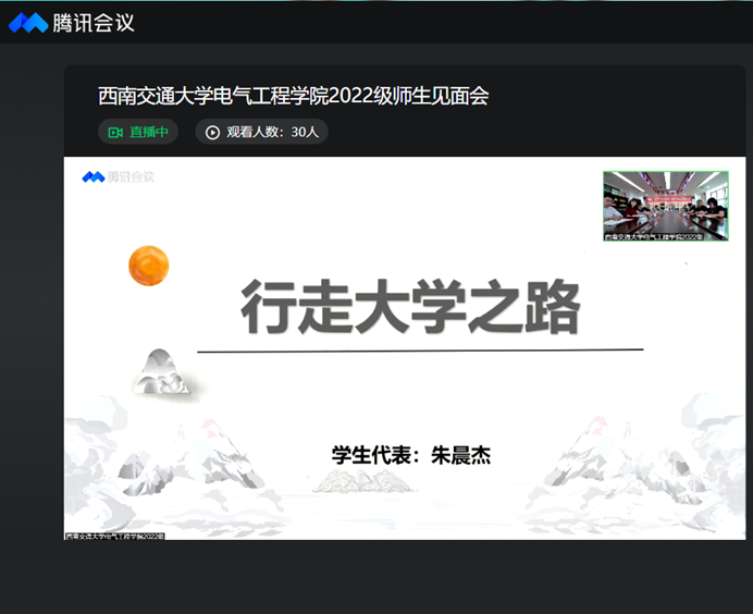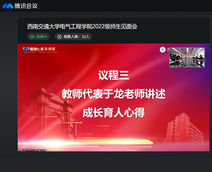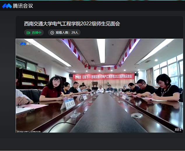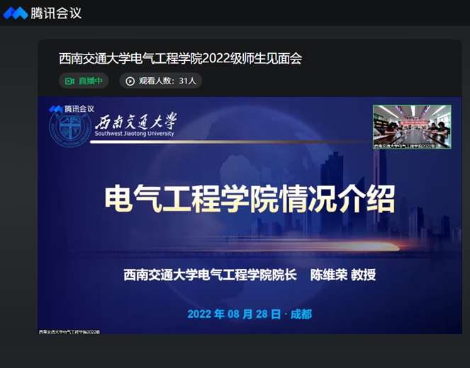 2022年8月28日上午10时,正妹av 2022级本科师生见面会在犀浦校区二号教学楼以线上直播方式举行,正妹av 院长陈维荣,党委书记罗乾超,副院长解绍锋、何晓琼、陈民武,党委副书记王轶、谢力,电力工程系主任吴积钦,电工电子系主任卿安永,电子信息工程系主任黄德青,教师代表于龙,2022级班导师,2022级本科辅导员、辅导员助理及2022级全体本科生参加了此次师生见面会。谢力副书记主持会议。