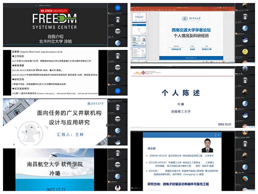 接着,参加论坛的学者进行交流讨论。来自北卡罗莱纳州立大学的涂皓博士介绍自己的学习经历与科研成果,主要研究方向为微电网分布式控制算法等方面;来自香港理工大学的赵景新博士介绍了自己的工作经厉、教育背景、论文发表情况等,他的研究方向为锌离子电池、织物器件及3D打印器件构建与应用。此外,北京交通大学王林博士、南昌航空大学冷璐教授、华中科技大学余兆函博士、香港理工大学叶琳博士、英国拉夫堡大学梁水保博士等也进行了个人情况、研究方向和科研成果分享。