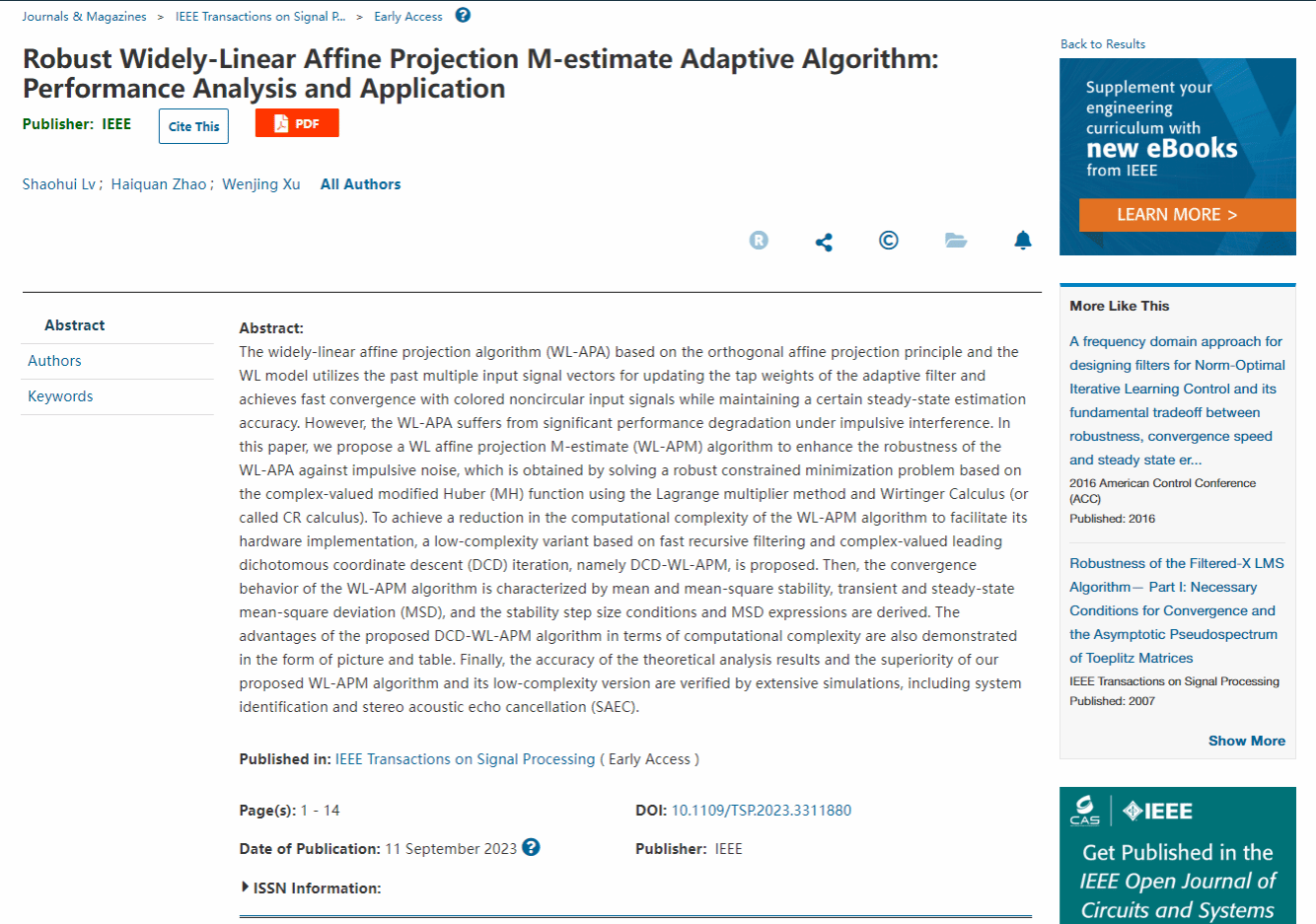 Robust Widely-Linear Affine Projection M-estimate Adaptive Algorithm: Performance Analysis and Application》被信号处理领域顶级期刊《IEEE Transactions on Signal Processing》接受,博士生吕少辉为第一作者,赵海全教授为通讯作者。该论文研究了宽线性仿射投影算法(WL- APA)抗脉冲噪声干扰问题。在论文中提出一种宽线性仿射投影M估计(WL-APM)算法来增强WL-APA对脉冲噪声的鲁棒性。同时,为了降低算法的计算复杂度以促进其硬件实现,提出了一种基于快速递归滤波和复值主导二分坐标下降迭代的低复杂度算法,即DCD-WL-APM。并理论分析了WL-APM算法的均值和均方稳定性、理论瞬态和稳态均方偏差(MSD)性能,得到了对应的稳定步长条件和MSD表达式。最后,通过系统辨识和立体声回波抵消(SAEC)等计算机仿真,验证了所提出算法的优越性。