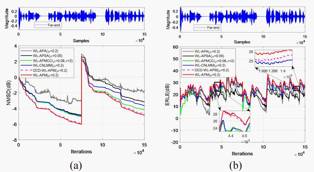 a)不同算法的NMSD性能曲线  (b)不同算法的ERLE性能