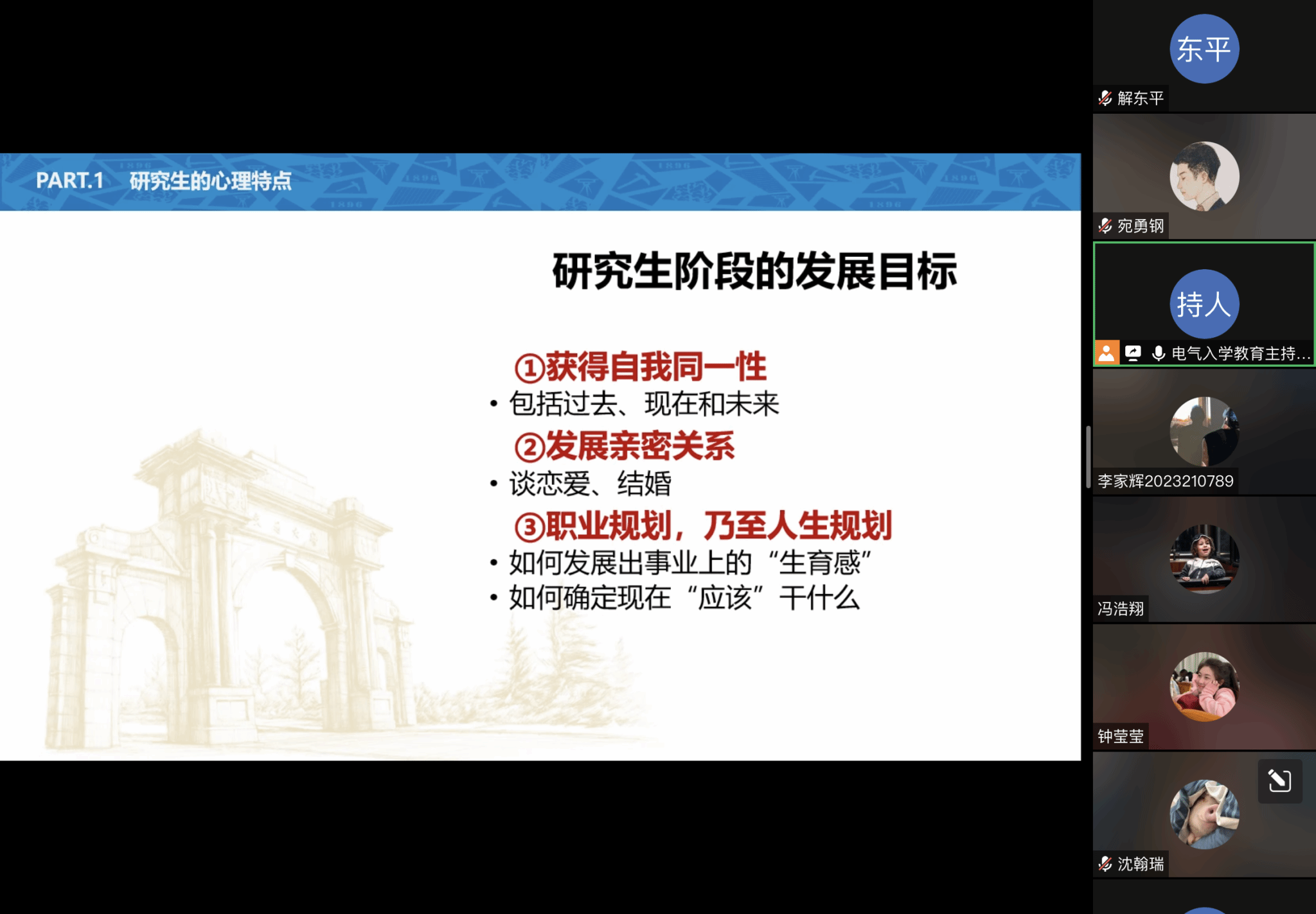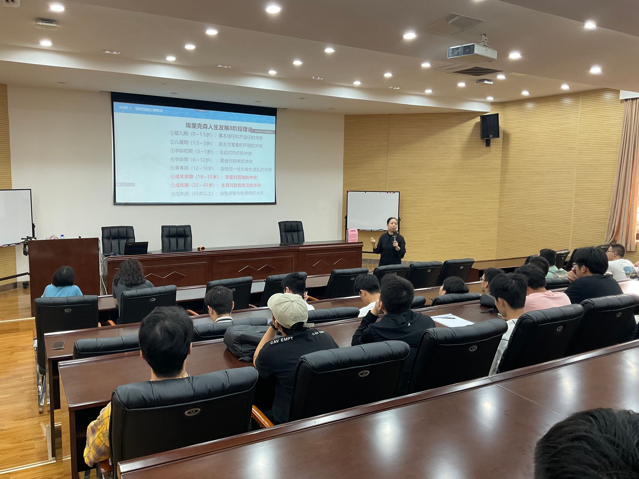 首先,高飞老师围绕研究生的心理特征,从研究生心理特点、研究生心理困境、积极应对与健康成长三个方面展开。高老师结合埃里克森人生发展八阶段理论,阐述了目前研究生阶段的主要冲突,即亲密对孤独的冲突。高飞老师同时以此为基础提出研究生的发展任务:获得自我同一性、发展亲密关系、职业规划乃至人生规划。