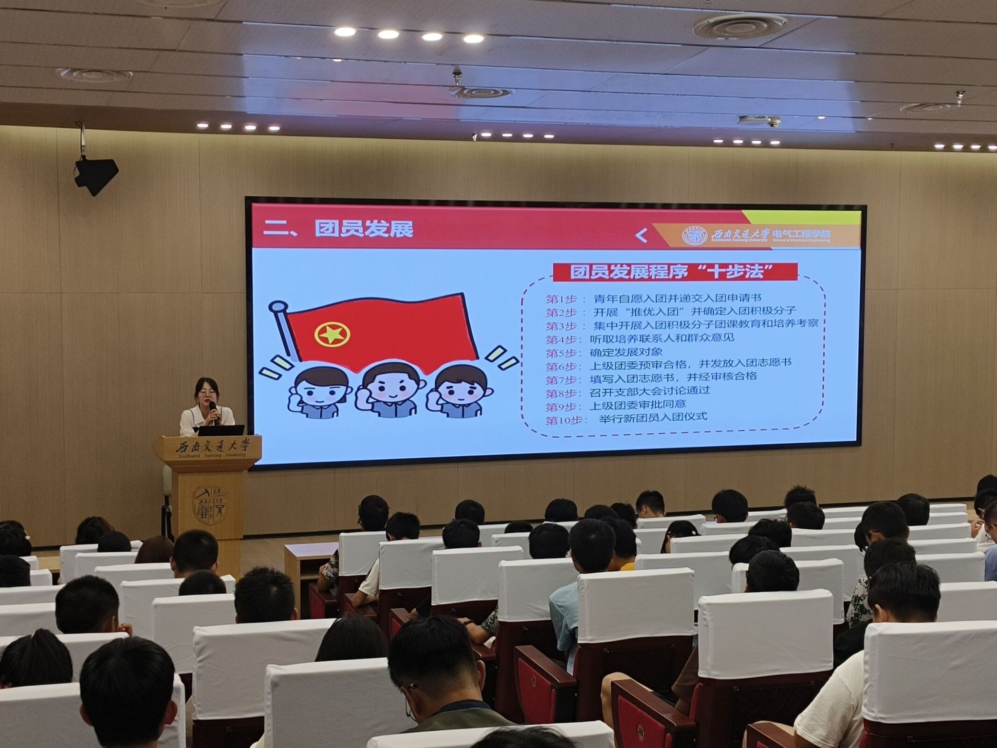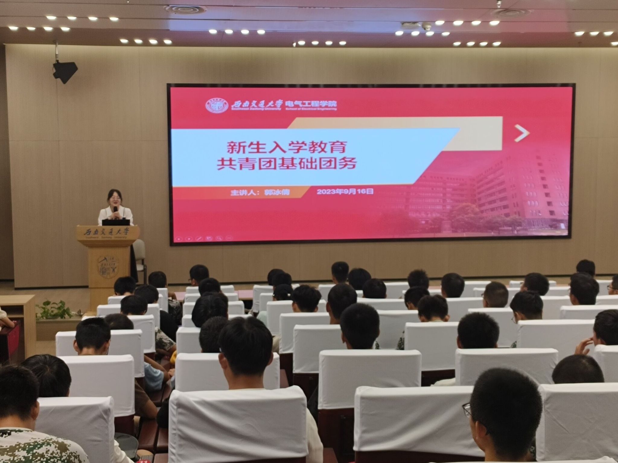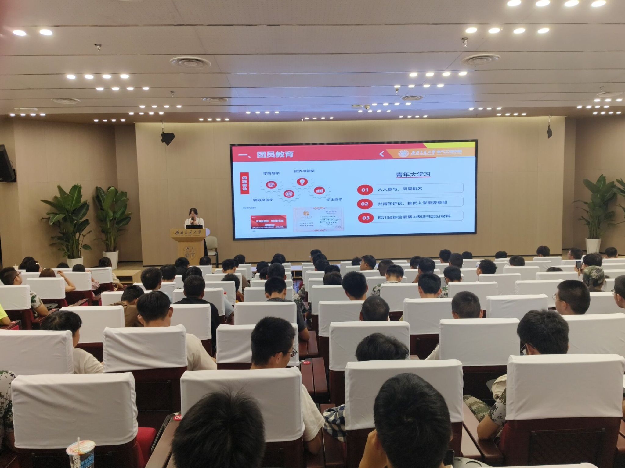 2023年9月16日晚上19:00,正妹av 本科2023级在正妹av 犀浦校区一号报告厅开展共青团基础团务专题讲座。此次讲座由辅导员郭冰倩老师主讲,电气学院本科2023级辅导员詹睿、罗霁轩和全体新生参与。