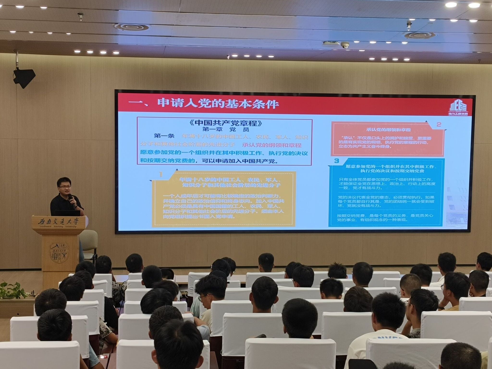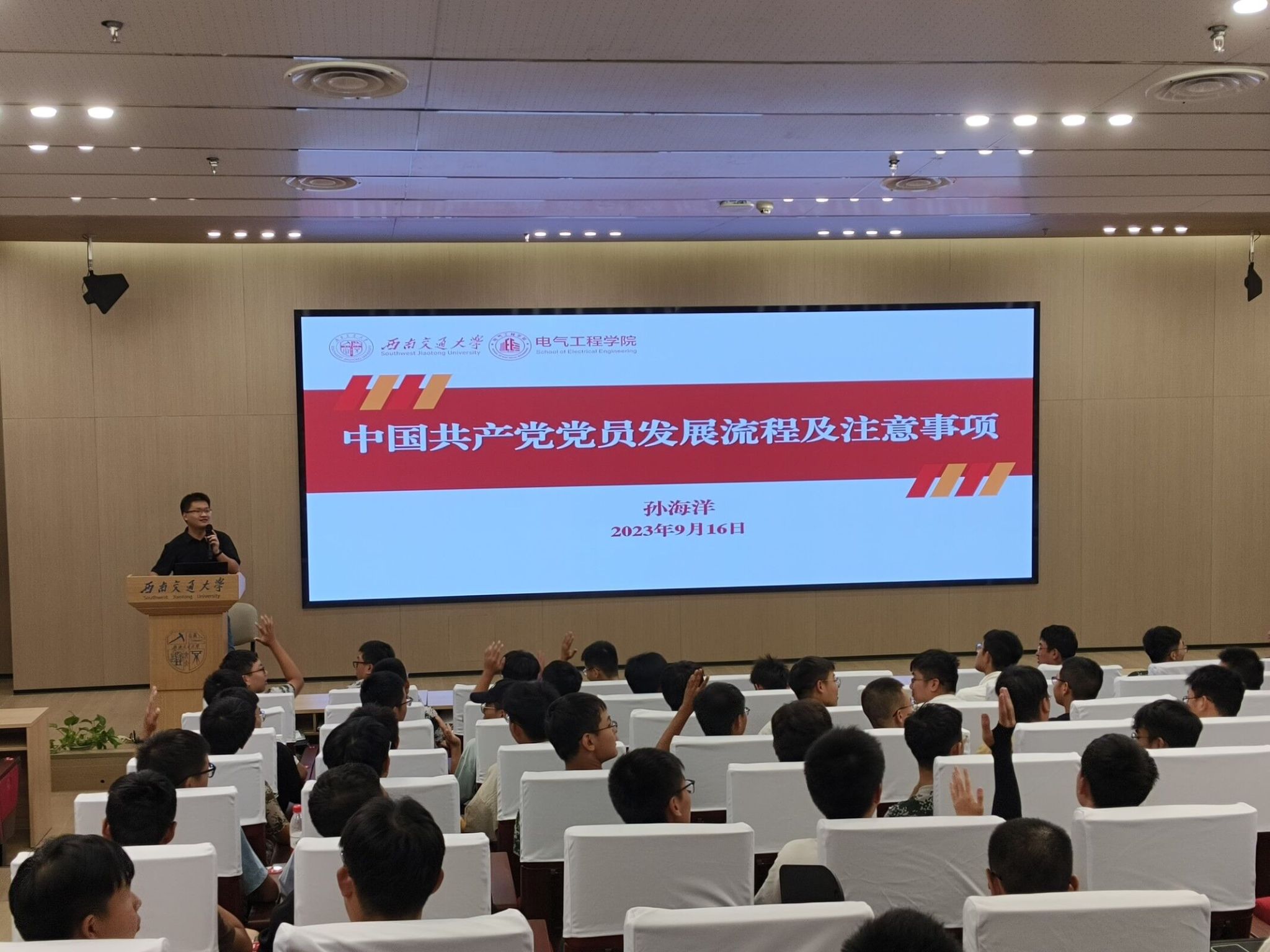 为深入学习贯彻习近平新时代中国特色社会主义思想,落实党的二十大重要精神,2023916日晚上2000,正妹av 本科2023级在正妹av 犀浦校区一号报告厅开展党员发展专题教育讲座。此次讲座由辅导员孙海洋老师主讲,电气学院本科2023级辅导员詹睿、罗霁轩和全体新生参与。