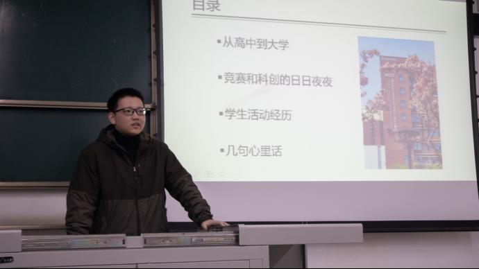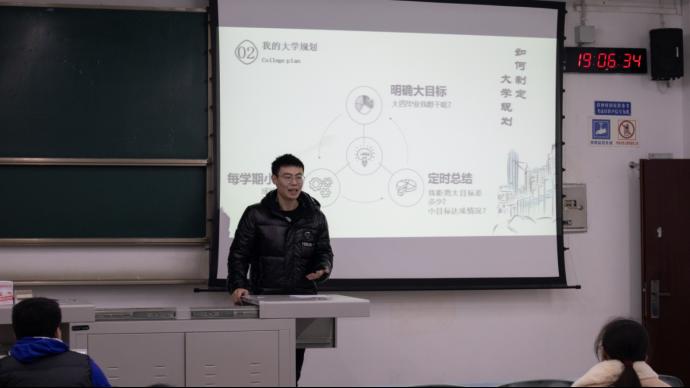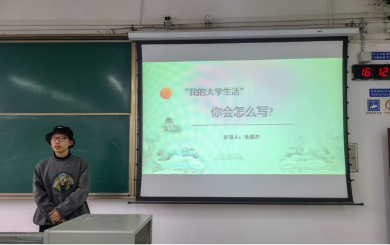 朱晨杰开篇便向同学们提出一个问题,“如果以‘我的大学生活’为题,写一篇作文,你会怎么写?”围绕着这个问题,他以自我介绍,学习之旅,干部经历,生活爱好,感悟总结五个模块来讲述自己会怎么写“我的大学生活”。在课程学习上,他主要强调了笔记、及时总结反思和自主学习的必要性,鼓励同学不要懈怠,抓紧时间提升自我。此外,他在课外竞赛和科研训练方面也结合自身经历给出了独到意见。丰富的干部经历不仅增强了他的责任心,也提高他的沟通交流能力和组织协调能力。他鼓励同学们去培养更多元、更开放、更有益身心的兴趣,不要沉迷于游戏和追剧。最后,他总结,有自己的定位,有时间的管理,有自学的能力才是当代青年人迈向成功的必由之路。