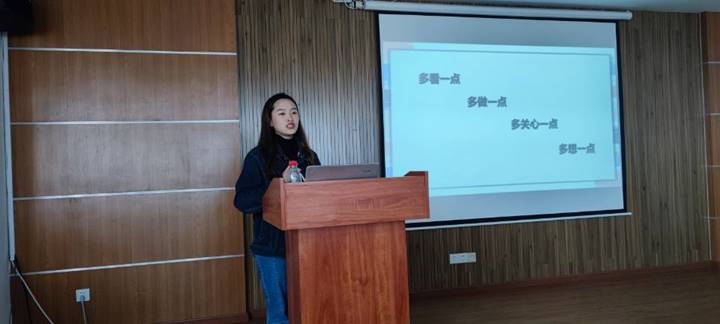 会议第二部分,由电气2019-11班班长杨语菲分享班级建设经验。杨语菲从“四个多一点”展开:一是多看一点,即应该观察比自身优秀的班级建设情况、管理方式,听取同学们的建议,并从中汲取营养;二是多做一点,如学院下达通知时,应先检索关键信息整合后再通知同学,不应只是机械地转发,要注重细节的处理和重点的突出;三是多关心一点,班委应充分了解班级同学的特点、关注同学心理情况,让同学们倍感温暖,主动融入班级建设中;四是多想一点,即在各种班级比赛中,思考从哪方面入手可以更好地展现出班级特色,在千篇一律的展示中让评委眼前一亮。最后杨语菲谈及学风建设和班团建设方面,提出了各班应定期进行团建,以合适的方式来增进同学间的感情;也应注重学风建设,设立一对一或者多对一帮扶机制,灵活开展集体早晚自习,形成浓厚的学习氛围。在证书考级方面,实行考级保险制度,鼓励同学进行四六级考试,形成持续性、长期性学习英语的态度。
