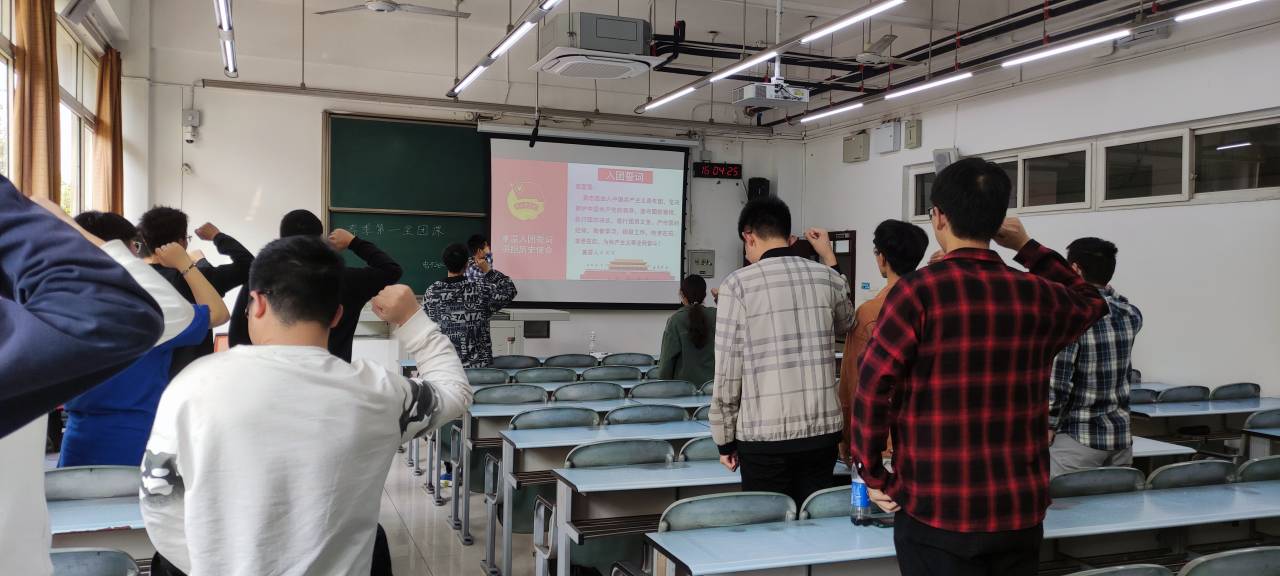 在响亮的团歌中,本次专题学习会正式开始。首先,由团支书为同学们讲述我们党从革命中走来、我们党从新中国建设中走来、我们党从改革开放中走来、我们党带领人民走进新时代四个部分内容,接着播放视频《习近平总书记讲述百年征程》《社会主义改造基本完成》《重温改革开放伟大壮举》《党的十八大以来的历史性成就和历史性变革》,最后全体团员重温了入团誓词。