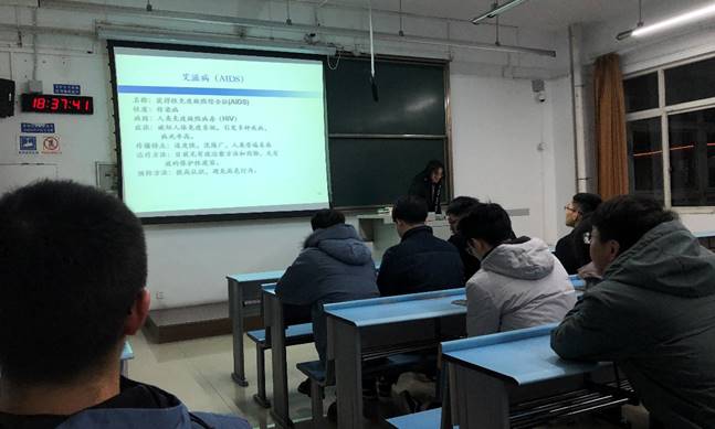 杨锐与黄云柯用图文并茂的课件,丰富详实的案例,全面宣讲了艾滋病在全球发生、传染蔓延、传播危害、预防治疗、宣传防控的背景和知识,从当代大学生的社会活动角度特点,重点介绍了认识艾滋病、预防艾滋病、关爱艾滋病人的社会、心理、传染性疾病预防控制的知识。青年学生既是受艾威胁的重点人群,也是预防艾滋病的主力军。课件介绍完毕后,大家共同观看了防艾宣传视频,同时呼吁大家消除对艾滋病患者的歧视,应给予他们精神上的支持。同学们现场参与互动,充分交流,此次活动有效增强了大家自我保护意识和抵御艾滋病侵袭的能力,对传播防艾知识和预防艾滋病校园传播起到积极作用。