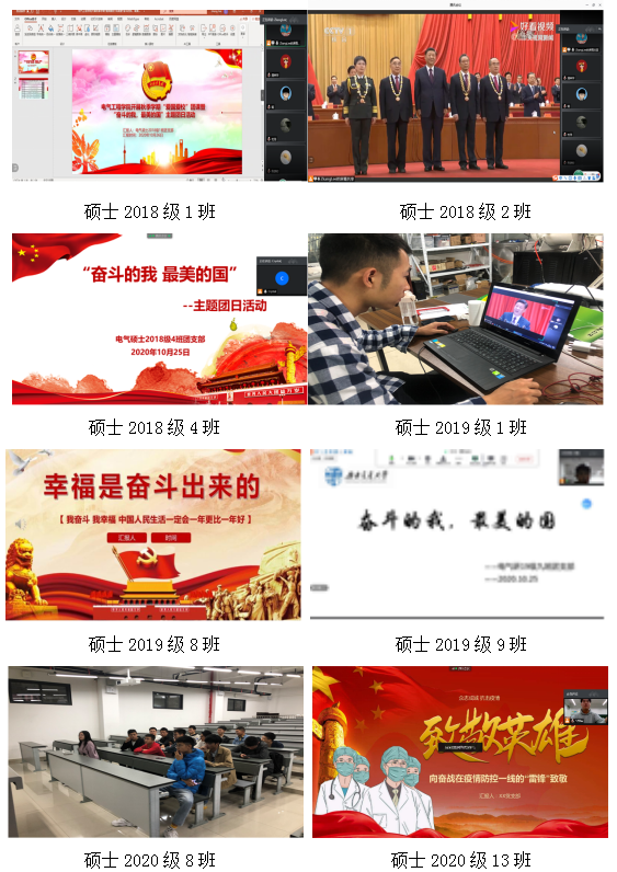 2020年10月,正妹av 30个研究生团支部纷纷开展了以“爱国爱校”为主题的团日活动,活动主题类别包括“青春告白祖国”、“青春告白交大”、“奋斗的我,最美的国”和“厉行节约 反对浪费”,充分展现交大电气学子的爱国荣校热情。