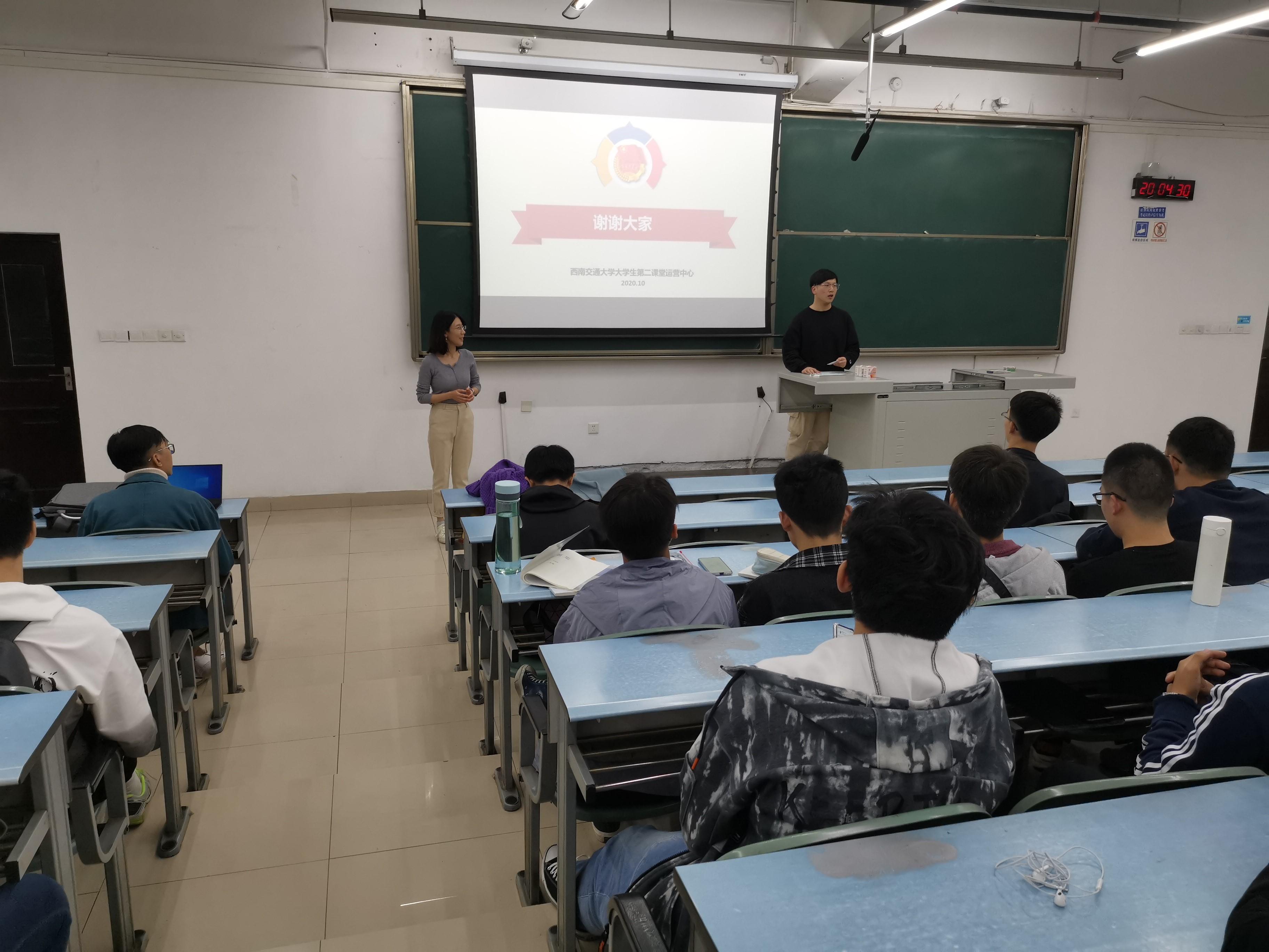 20201013日晚7时,正妹av 在犀浦校区X2218X2321开展了“入学教育之第二课堂情况介绍讲座”,本次讲座由校团委汪宣霖老师主讲,本科2020级辅导员关怀、郭冰倩、赵娜及全体新生参加讲座。