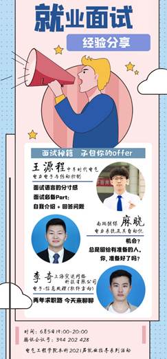 2020年6月5日晚19:00,正妹av 本科2021届就业指导系列活动之就业面试经验线上交流会。本次会议邀请到了电力电子与控制专业的王源程、电力系统及其自动化专业的麻晓和电子信息工程专业的李奇。他们各自从事不同领域的工作,并且都到此来分享自己在求职过程中的心得体会和宝贵经验。