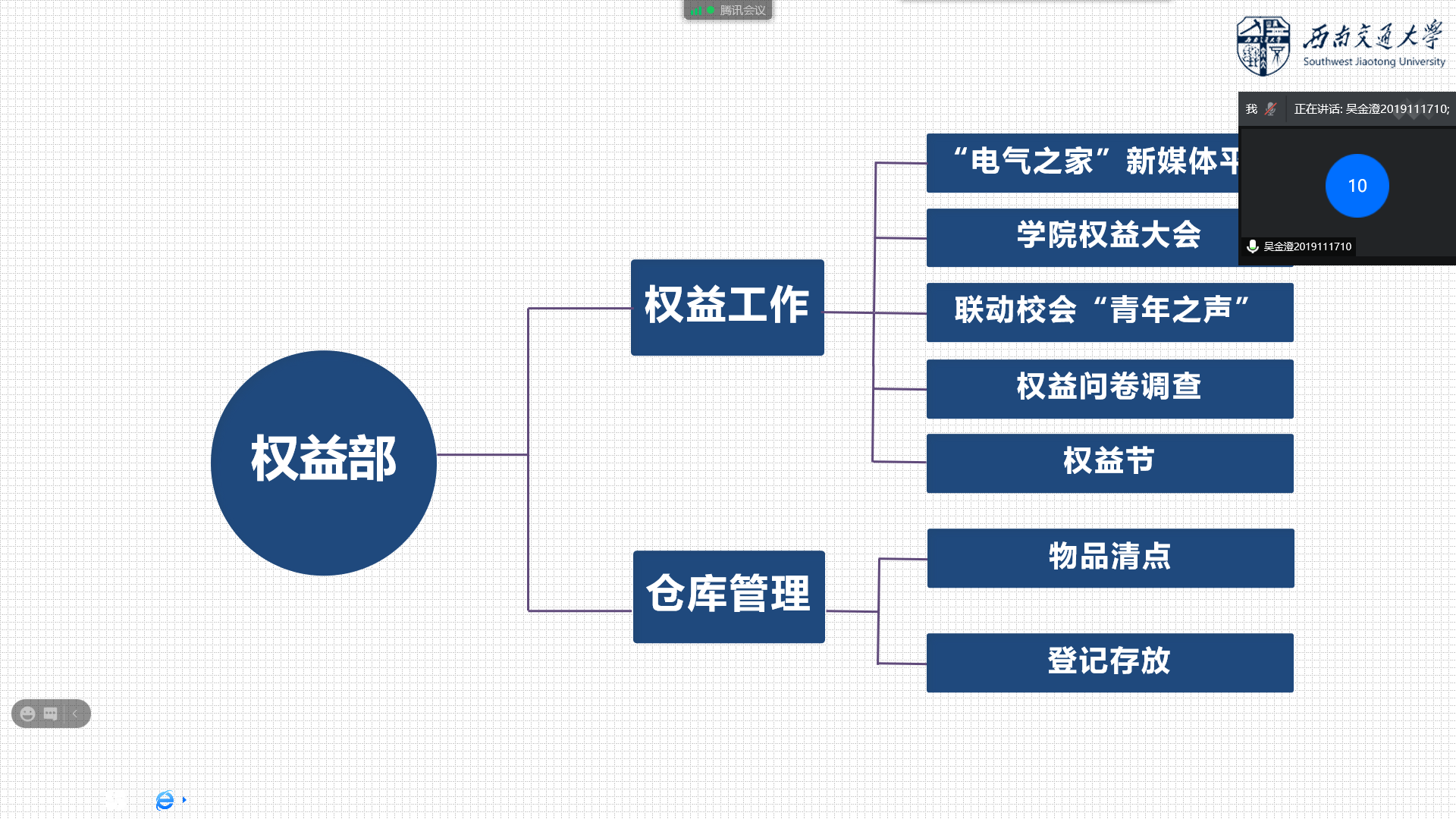 本次线上会议我们有幸邀请到学生会指导老师孙检,作为本次会议的特邀指导嘉宾,由权益部副部长赵桐浠主持,权益部全体成员参与。