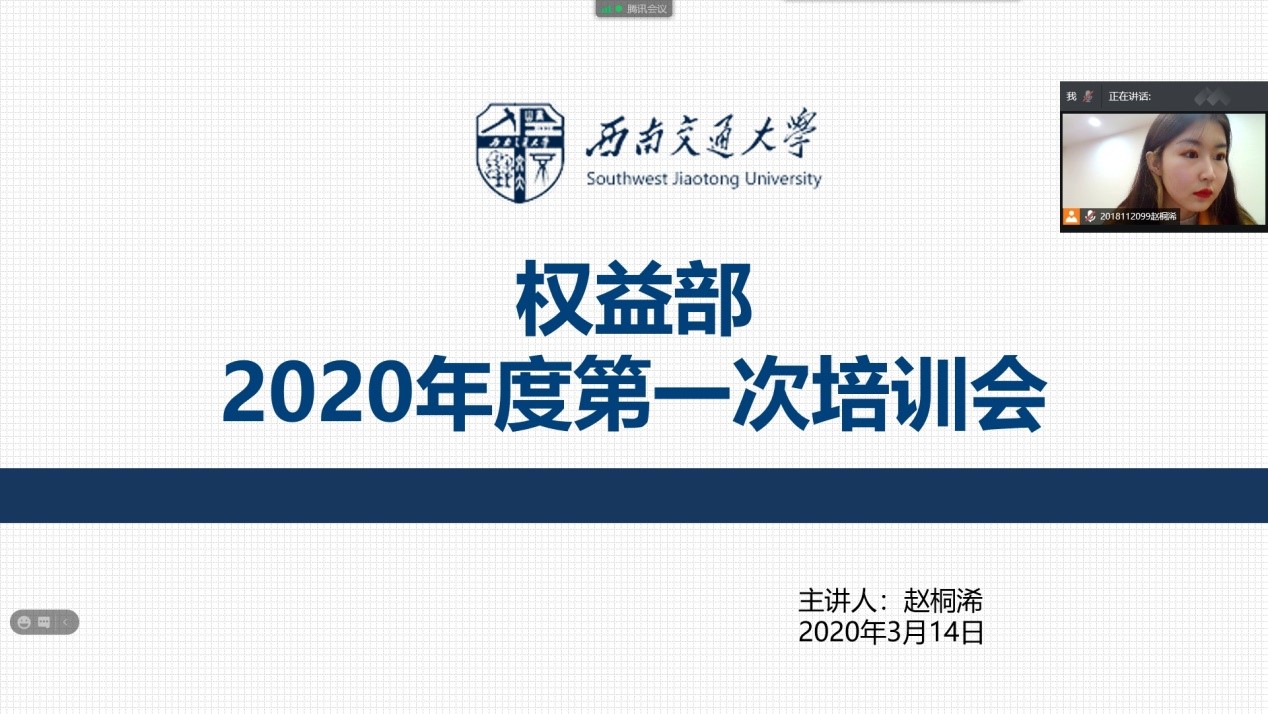 为了响应校学生会权益部的号召,弘扬“全心权益”的工作精神,向正妹av 学生会权益部的新成员们普及权益工作精神,提高权益部新成员的权益工作意识,正妹av 学生会权益部由于新冠肺炎疫情原因,于2020年3月14日,在线上召开了权益部2020年的第一次权益工作培训会议。