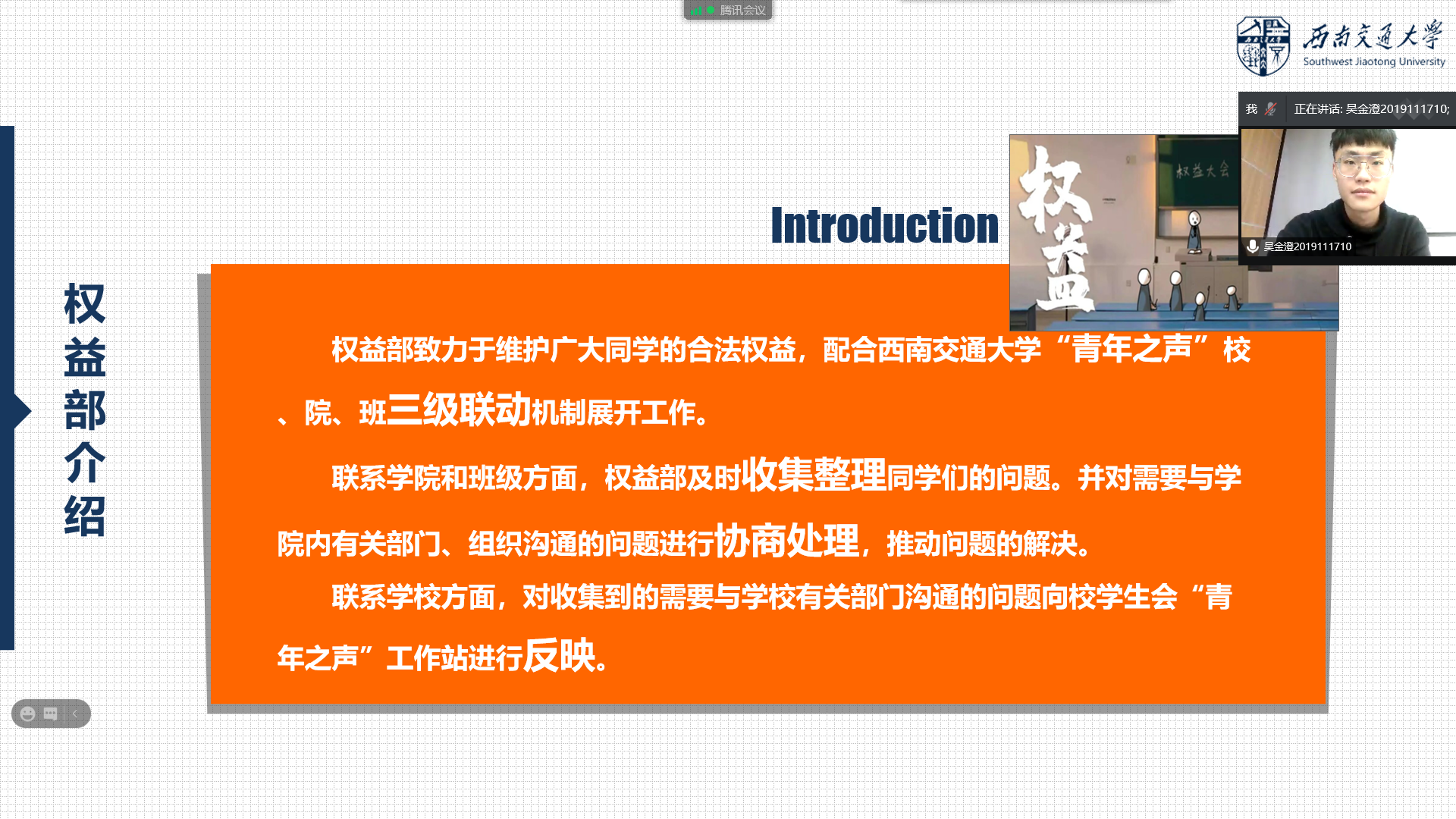 本次线上会议主要由三部分组成。首先由主持人赵桐浠简单介绍权益部工作,总结汇报权益部上半学期的工作成果。