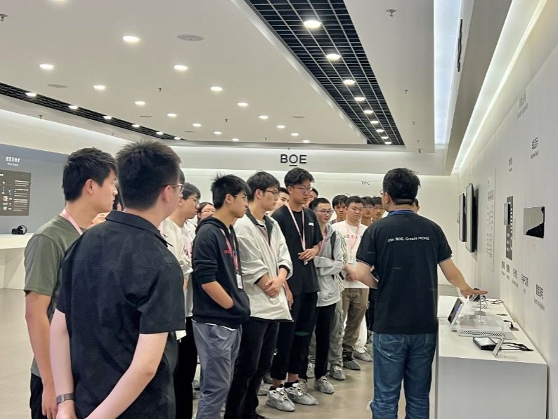 首先,工作人员为同学们讲解了京东方的发展历史和愿景,并介绍了京东方的主要业务、发展状况以及取得的相关成绩。同时也近距离接触了拼接屏、8K大屏、卷轴屏和折叠屏等半导体显示技术产品,沉浸体验了智能一体机、数字化体检等智慧物联产品,深入了解京东方“1+4+N”生态链架构在生活中的多样化应用场景。