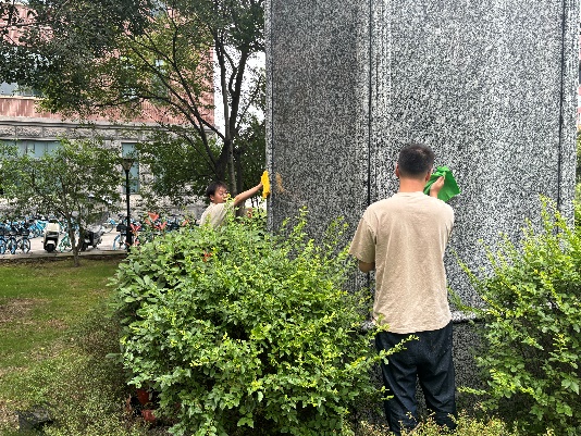 接下来,党支部成员们开始清洁电气馆楼下的雕塑。成员们分工合作,认真擦拭雕塑,有的负责擦拭雕塑的底座,有的负责清洁雕塑的主体部分。在大家的努力下,雕塑表面的灰尘和污垢被清理干净。