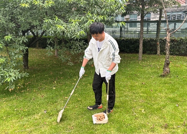 最后,党支部成员们在电气馆楼下的草坪上开始捡拾垃圾。大家戴上一次性手套,拿着垃圾袋,弯腰捡起散落在草坪上的纸屑、塑料瓶、烟头等各类垃圾,支部成员们仔细搜寻,不放过任何一个角落,确保草坪恢复整洁和美丽。